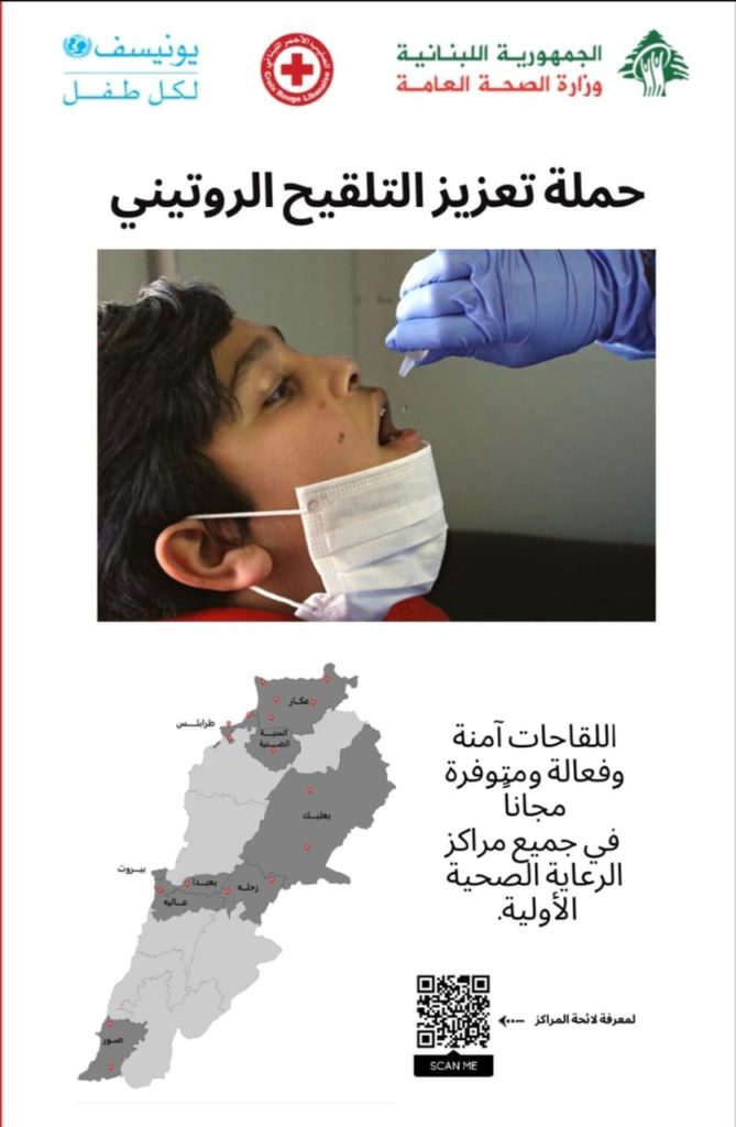 تنظم وزارة الصحة العامة في لبنان و بدعم من منظمة اليونيسف والصليب الاحمر اللبناني حملة لتعزيز التلقيح الروتيني للأطفال من عمر شهرين لغاية ١٨ سنة وذلك يومي السبت والثلاثاء ١٣و١٦ اب من الساعة ٨:٣٠ صباحاً لغاية ٤:٠٠ مساءً