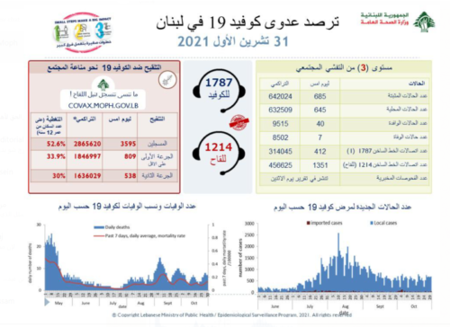 أعلنت ​وزارة الصحة العامة​، في تقريرها اليومي، تسجيل 685 إصابة جديدة بفيروس “كورونا” بين المقيمين والوافدين، رفعت الحالات المثبتة إلى 642024، بالإضافة إلى 7 حالات وفاة، خلال الـ24 ساعة الماضية.