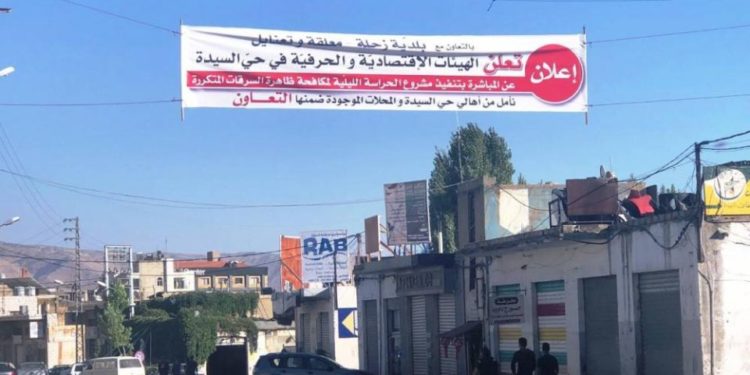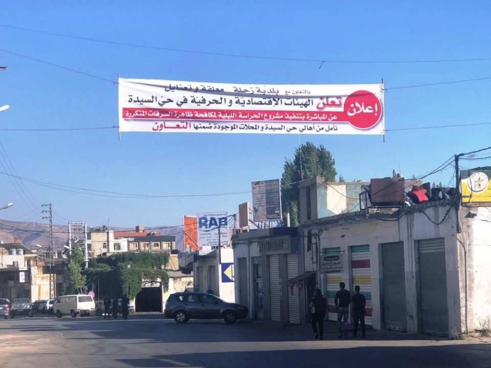 على مدخل حي السيدة في مدينة زحلة، من حيث تنطلق منطقتها الصناعية، رفعت منذ أيام لافتة، حملت الإعلان التالي: «تعلن الهيئات الإقتصادية والحرفية في حي السيدة، بالتعاون مع بلدية زحلة – معلقة وتعنايل، عن المباشرة بتنفيذ مشروع الحراسة الليلية لمكافحة ظاهرة السرقات المتكررة، نأمل من أهالي الحي والمحلات الموجودة ضمنها التعاون».