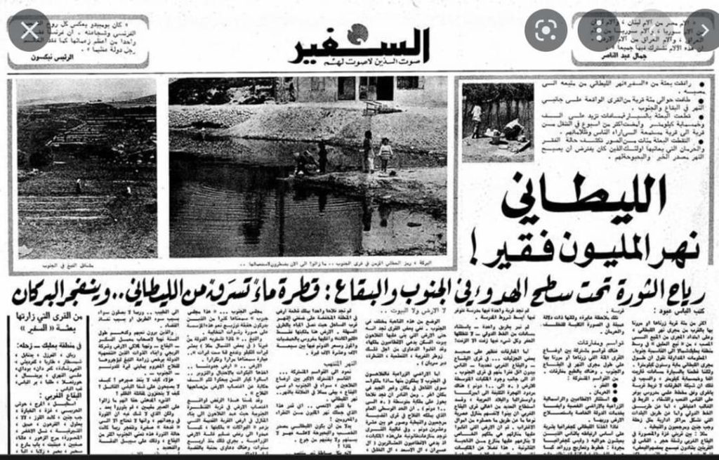 في 1974 – اي منذ 48 عاما – حمل الكاتب الصحافي الياس عبود، ابن بلدتي القرعون ووالد الشهيدة لولا عبود، كاميرَته ودفتره وقلمه وجال في بلدات وقرى حوض الليطاني من منبعه في العلاق الى مصبه في القاسمية واجرى مقابلات في 100 بلدة وقرية على امتداد ال 170 كلم التي ينساب عليها النهر، ونشر تحقيقه في جريدة السفير تحت عنوان “الليطاني: نهر المليون فقير”. كان هذا عشية الحرب الاهلية والفروقات الاجتماعية الواسعة والانماء اللامتوازن، واستضعاف الدولة. وحدث ما حدث بعدها من مآسي ودمار وتفكك لاوصال الدولة وانقسام المجتمع.