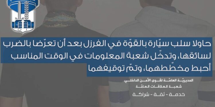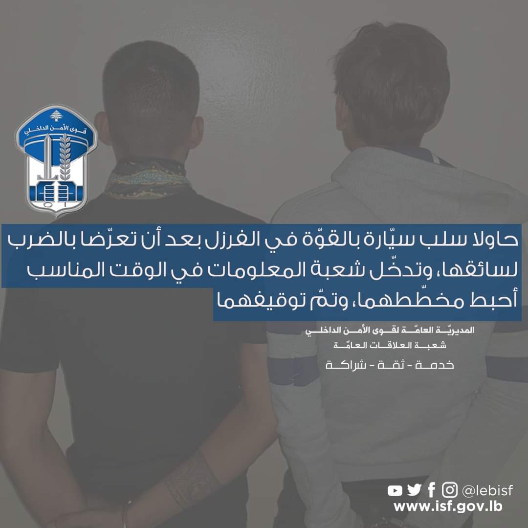 بنتيجة المتابعة والرّصد، تمكّنت إحدى دوريّات الشّعبة، ليل تاريخ 7-10-2022، من توقيف شخصين مجهولَين كانا يتعرّضان بالضرب لسائق سيّارة أجرة من نوع “تويوتا كورولا” في بلدة الفرزل البقاعية، وهما كلٌّ من: