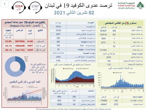 أعلنت وزارة الصحة العامّة في تقريرها اليومي حول مستجدات فيروس “كورونا” تسجيل 822 إصابة جديدة ب “كورونا” (821 محلية و 1 وافدة ) ليصبح العدد الإجمالي للإصابات 643047.