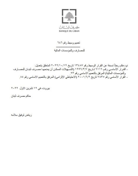 أصدر مصرف لبنان تعميماً وسيط يحمل رقم 646 موجّه للمصارف وللمؤسسات المالية.