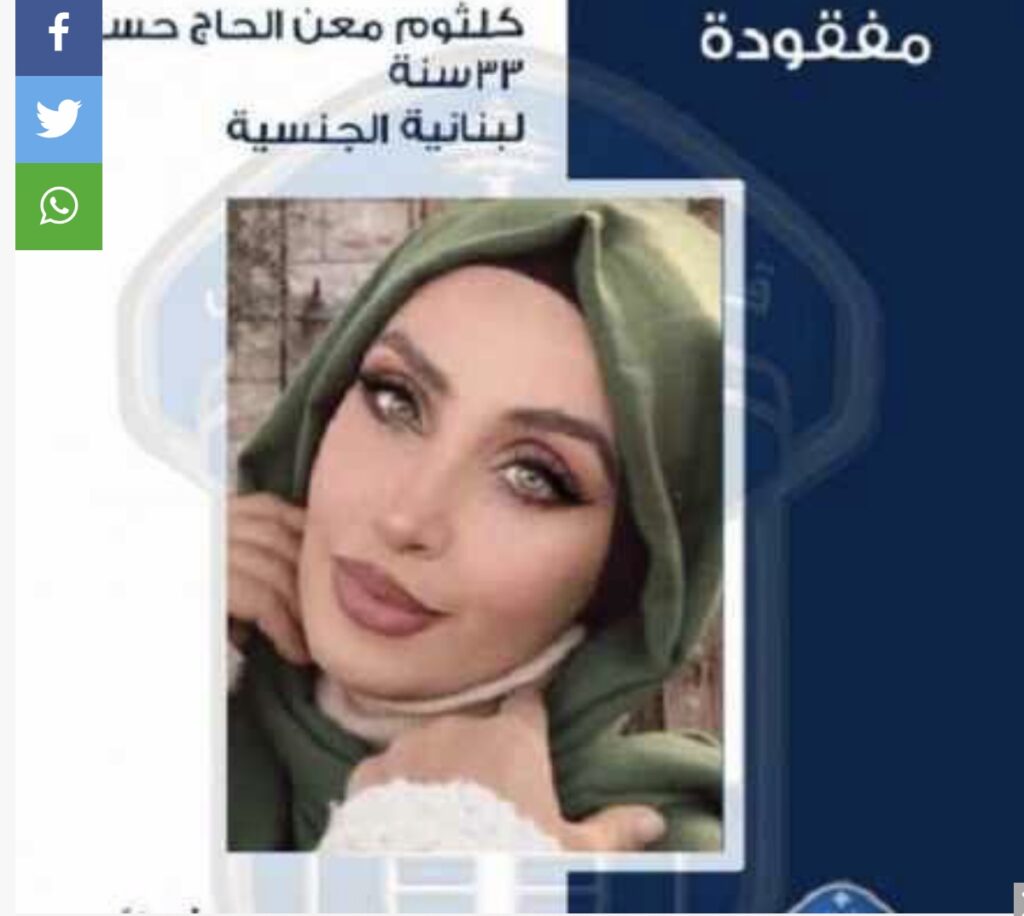 عممت المديرية العامّة لقوى الأمن الداخلي بناءً على إشارة القضاء المختص صورة المفقودة: كلثوم معن الحاج حسن (مواليد عام 1989، لبنانيّة الجنسيّة)، التّي غادرت مكان إقامتها في بلدة حوش النبي-بعلبك بتاريخ 2-10-2022، ولم تَعُد لغاية تاريخه”.