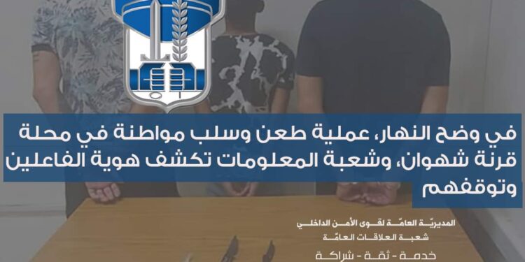 بتاریخ 17-10-2022 وبعد عملية رصد ومراقبة دقيقة في مدينة طرابلس، تمكّنت دوريات الشعبة من تنفيذ عملية متزامنة أسفرت عن توقيفهما وضبط الدراجة والسكين المستخدمين في عملية السلب.