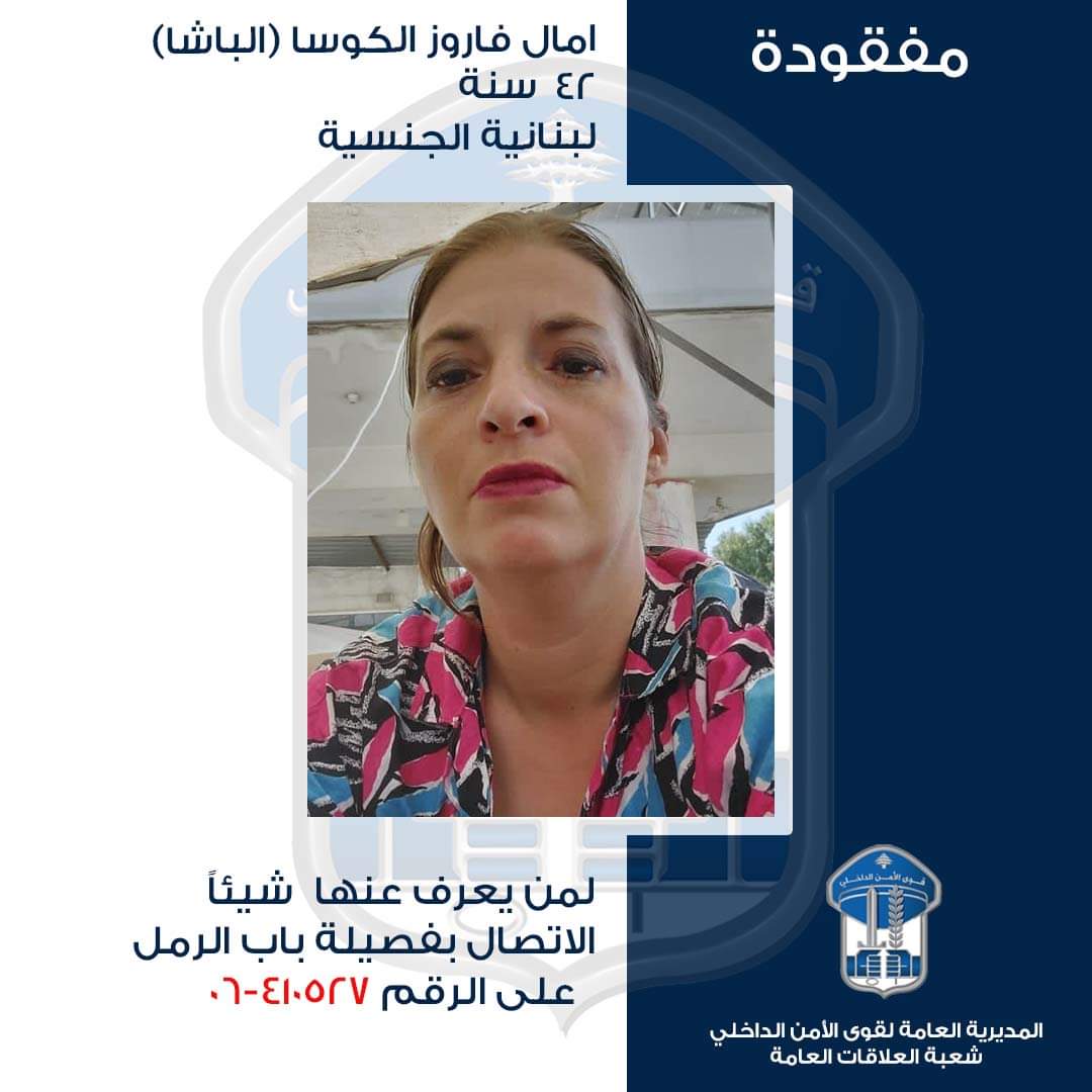 تُعمِّم المديريّة العامّة لقوى الأمن الدّاخلي، بناءً على إشارة القضاء المختص، صورة المفقودة:
