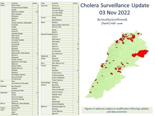 أعلنت وزارة الصحة العامة، في تقرير نشرته عن حالات الكوليرا، تسجيل 7 إصابات جديدة رفعت العدد التراكمي إلى 413، فيما لم يتم تسجيل أي حالة وفاة، وسجل العدد التراكمي للوفيات 18.