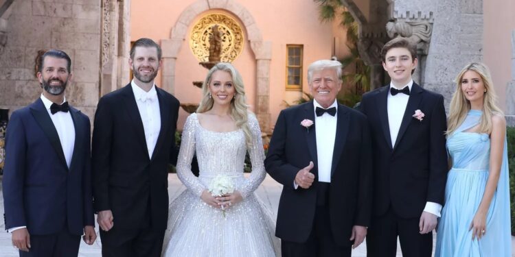 وفي التفاصيل، تزوجت تيفاني (29 عاماً) من مايكل بولس (25 عاما) في منتجع مارالاغو (Mar-a-Lago) الخاص بعائلة ترامب، بعد مرور العاصفة الاستوائية نيكول وقبل 3 أيام من إعلان #دونالد ترامب ترشحه للانتخابات الرئاسية لعام 2024.