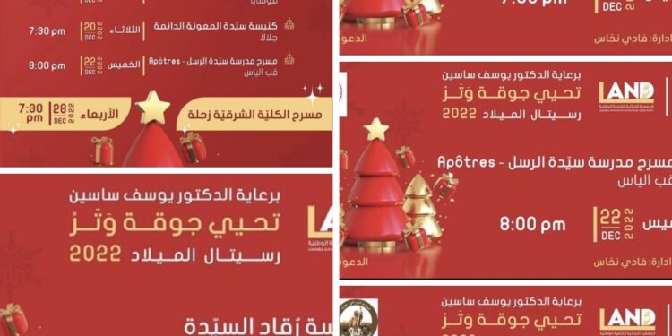 بمناسبة عيد الميلاد المجيد، تنظم جمعية LAND برعاية الدكتور يوسف ساسين رسيتالات ميلادية تحييها جوقة وتر وذلك في المواعيد التالية: