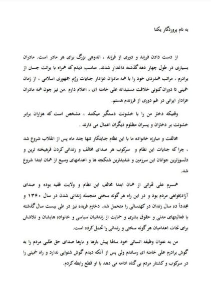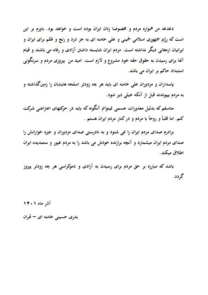 في رسالة “شديدة اللهجة”  نشرها نجلها.. “بدري” شقيقة المرشد الأعلى في #إيران علي #خامنئي تتبرأ منه ومن “خلافته الاستبدادية” وتتمنى أن ترى انتصار الشعب وإسقاط النظام الحالي وتقول: “شقيقي لا يستمع لصوت الشعب رغم وصوله إليه”