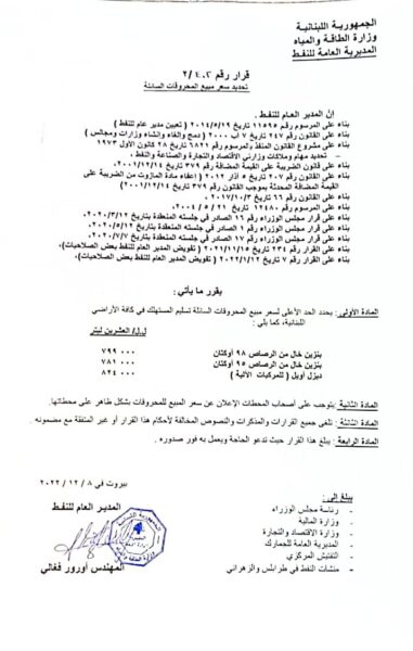 صدر عن وزارة الطاقة والمياه صباح اليوم الخميس, جدول جديد للمحروقات.