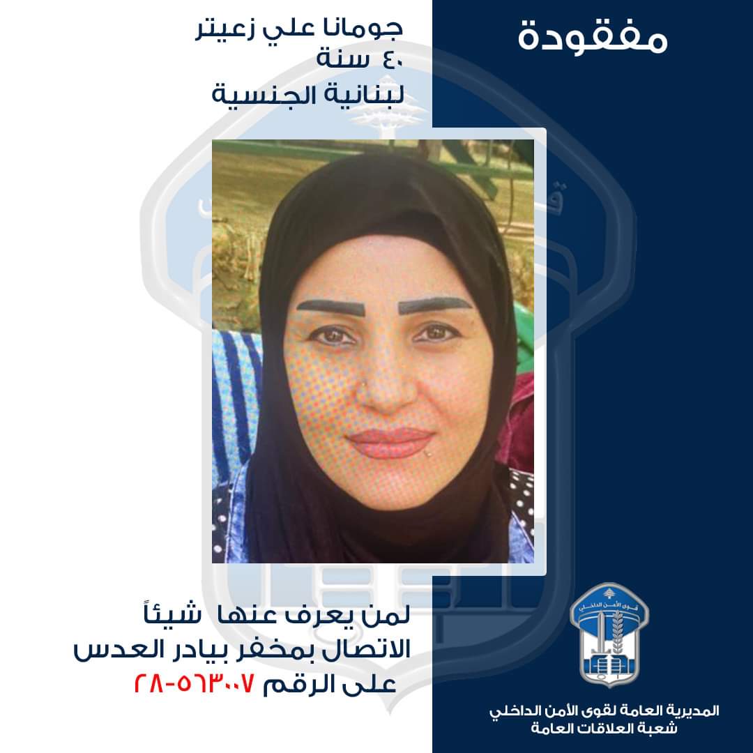 تُعمِّم المديريّة العامّة لقوى الأمن الدّاخلي، بناءً على إشارة القضاء المختص، صورة المفقودة: