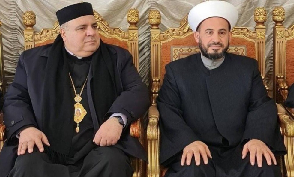 من لقاء التهنئة الذي جمع المطران إبراهيم مع المفتي الغزاوي