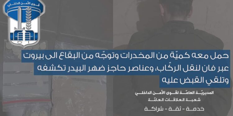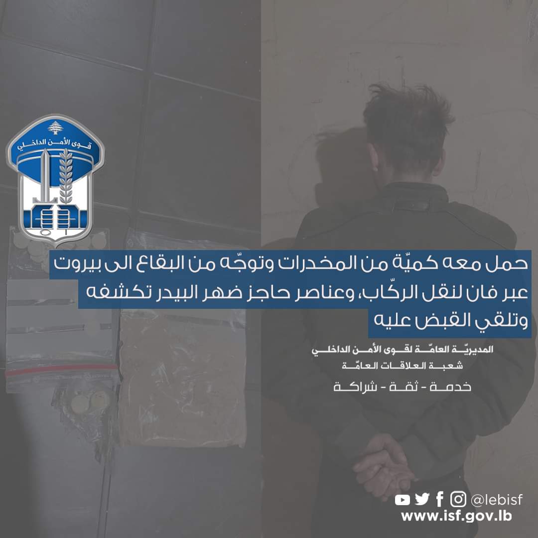 حمل معه كميّة من المخدرات وتوجّه من البقاع الى بيروت عبر فان لنقل الركّاب، وعناصر حاجز ضهر البيدر تكشفه وتلقي القبض عليه.