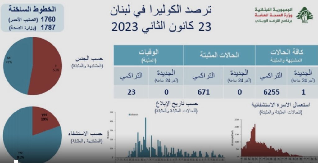 كذلك نشرت وزارة الصحة العامة تقريرا عن حالات الكوليرا في لبنان ، اذ لم يسجل اي إصابة جديدة، وعليه استقر العدد التراكمي للحالات المثبتة على 671، كما لم يتم تسجيل اي حالة وفاة وسجل العدد التراكمي لللوفيات23.
