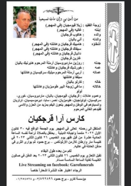 وجد الشاب اللبناني كارس آرا قرجكيان نهاية الشهر الماضي، جثة هامدة داخل كارج منزله في كندا- ولاية تورونتو.