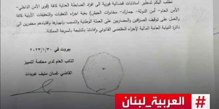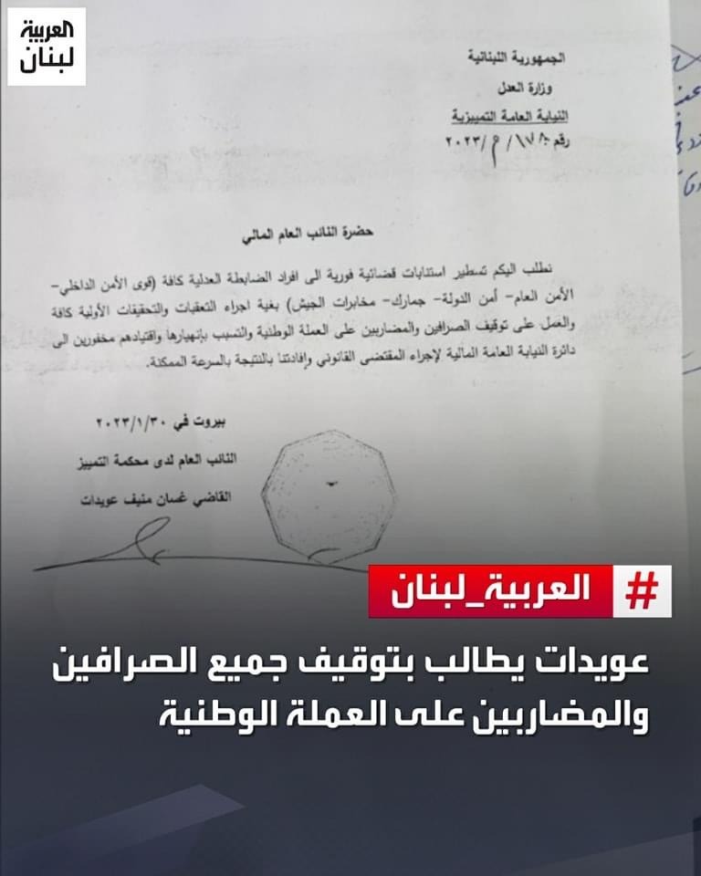 وجه مدعي عام التمييز القاضي غسان عويدات كتابا الى النائب العام المالي القاضي علي ابراهيم، طالبه فيه بتسطير استنابات قضائية فورية إلى افراد الضابطة العدلية كافة (قوى الأمن الداخلي- الأمن العام -أمن الدولة -جمارك -مخابرات الجيش)، بغية اجراء التعقبات والتحقيقات الأولية كافة والعمل على توقيف الصرافين والمضاربين على العملة الوطنية والتسبب بإنهيارها واقتيادهم مخفورين إلى دائرة النيابة العامة المالية لإجراء المقتضى القانوني وإفادتنا بالنتيجة بالسرعة الممكنة.