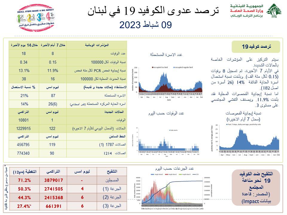 أعلنت وزارة الصحة العامة في تقرير نشرته مساء اليوم عن حالات كورونا، “تسجيل 122 إصابة جديدة رفعت العدد التراكمي للحالات المثبتة إلى 1229915، كما تم تسجيل حالة وفاة واحدة”.