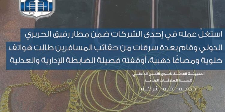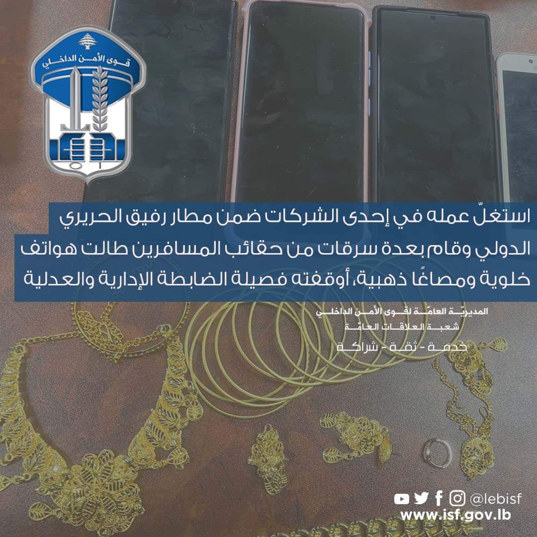 توافرت معلومات لدى فصيلة الضابطة الادارية والعدلية في سرية مطار رفيق الحريري الدولي في وحدة جهاز أمن السفارات والإدارات والمؤسسات العامة، أنه بتاريخ 20-1-2023 سافر أحد المواطنين من لبنان متوجهاً الى دبي، وبعد وصوله الى وجهته اكتشف أنه تعرّض لعملية سرقة طالت /4/ هواتف خلوية من داخل حقيبة السفر.