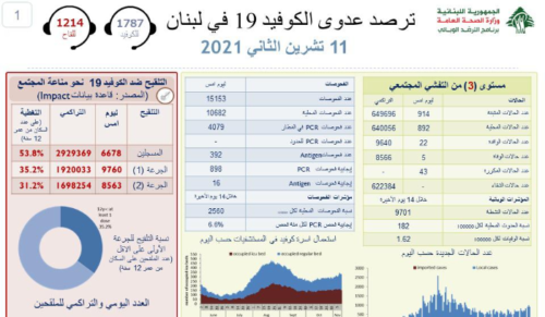 أعلنت وزارة الصحة العامة في تقريرها اليومي تسجيل 914 إصابة جديدة بفيروس كورونا رفعت العدد التراكمي للحالات المثبتة الى 649696، كما تم تسجيل 5 حالات وفاة.