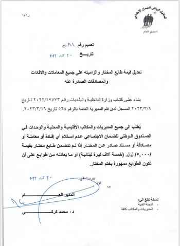 طلب المدير العام للصندوق الوطني للضمان الاجتماعي، من “جميع المديريات والمكاتب الاقليمية والمحلية والوحدات في ​الصندوق الوطني للضمان الاجتماعي​ عدم استلام أي إفادة أو معاملة أو مصادقة أو مستند صادر عن المختار إذا لم تتضمن طابع مختار بقيمة 5000 ل.ل. (خمسة آلاف ليرة لبنانية)، أو ما يعادله من طوابع، على أن تكون الطوابع ممهورة بختم المختار”.