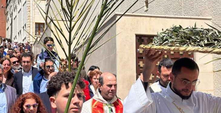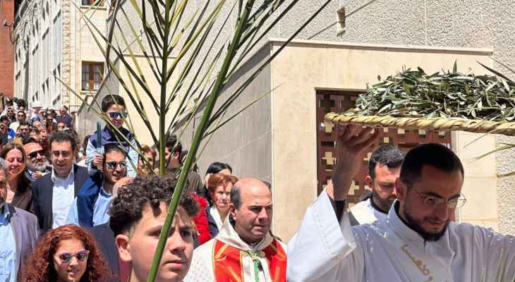بعد القداس طاف معوض والمؤمنون حول الكنيسة بزياح الشعانين حاملين الشموع واغصان الزيتون.