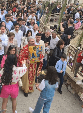 بعد القداس طاف الاب معلوف والمؤمنون بزياح الشعانين حاملين الشموع واغصان الزيتون.