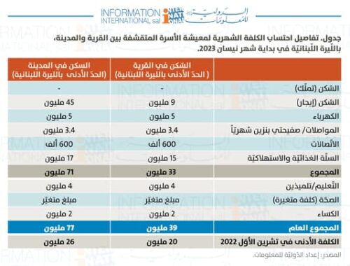 – السّكن: الحدّ الأدنى لإيجار المنزل في القرية هو نحو 5 مليون ليرة شهرياً، ويصل في المدينة إلى 45 مليون ليرة شهرياً وربّما أكثر، تبعاً للمنطقة ووضعيّة والمسكن ومساحته، علماً بأنّ الأسعار أصبحت تحدّد الآن بالدولار النّقدي.