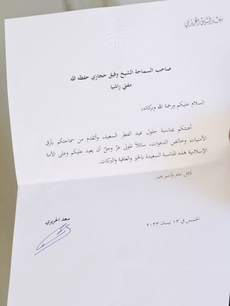 وشكر المفتي حجازي الرئيس سعد الحريري على رسالة التهنئة مؤكدا بأن الرئيس سعد الحريري كان ولا زال عنوانا للإستقرار وضمانة لبنان