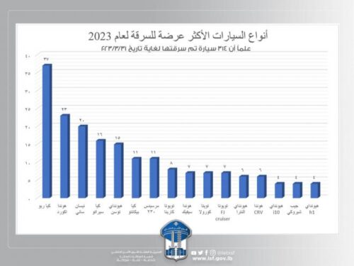 عمّمت المديرية العامة لقوى الأمن الداخلي رسماً بيانياً لـ /16/ نوعًا من السيارات التي هي الأكثر عرضةً للسرقة في خلال عام 2023، والتّي بلغ عددها حتى تاريخ 31-03-2023 /314/ سيارة، وفي هذا الإطار قامت قوى الامن الداخلي بتوقيف /50/ شخصًا.