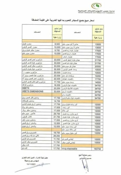أصدرت إدارة حصر التبغ والتنباك اللبنانية لائحة جديدة بأسعار الدخان على أنواعه و “المعسّل” الخاص بالنرجيلة، وقد جاءت اللوائح على النحو التالي: