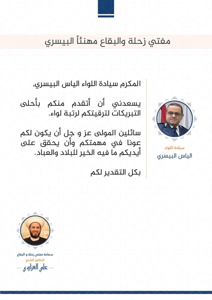 قدم سماحة مفتي زحلة و البقاع الدكتور الشيخ علي الغزاوي التهاني والتبريكات لسيادة اللواء الياس البيسري لمناسبة ترقيه لرتبة اللواء.