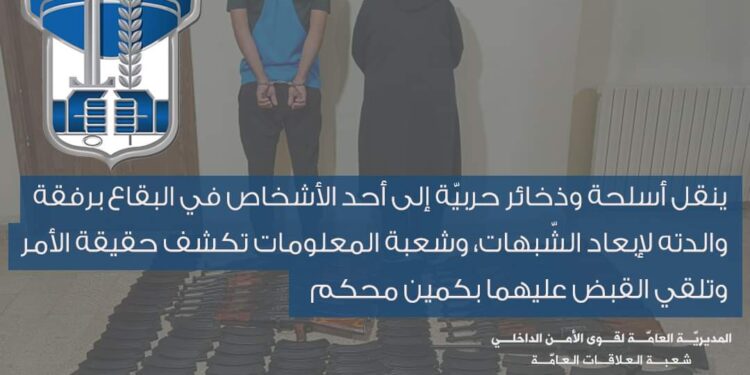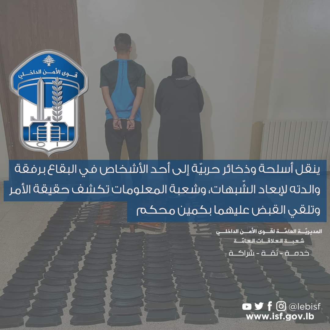 بنتيجة المتابعة المستمرة التي تقوم بها قوى الأمن الداخلي لمكافحة الجرائم في مختلف المناطق اللبنانية وملاحقة المتورّطين بها وتوقيفهم، توافرت معلومات لشعبة المعلومات في قوى الأمن الداخلي حول قيام مجهول بنقل أسلحة وذخائر في منطقة البقاع.