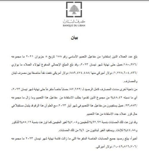 أعلن مصرف لبنان في بيان، عن العدد الذي بلغه العملاء الذين استفادوا من مفاعيل التعميم رقم 158 الصادر بتاريخ 8 حزيران 2021. وتجدون التفاصيل في الصّورة المرفقة.
