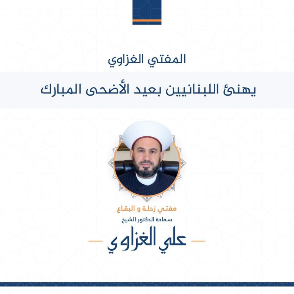 هنأ سماحة مفتي زحلة والبقاع الدكتور الشيخ علي الغزاوي اللبنانيين عموما والمسلمين خصوصا في عيد الأضحى المبارك سائلاً المولى عز وجل أن يكون عيد خير وسلامٍ على الأمة الإسلامية والعربية وذلك في خطبتي صلاة العيد والتي أقيمت في بلدة برالياس صلاة موحدة للجميع في ملعب البلدة.
