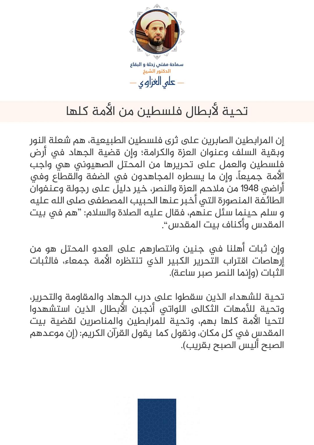 إن المرابطين الصابرين على ثرى فلسطين الطبيعية، هم شعلة النور وبقية السلف وعنوان العزة والكرامة؛ وإن قضية الجهاد في أرض فلسطين والعمل على تحريرها من المحتل الصهيوني هي واجب الأمة جميعاً، وإن ما يسطره المجاهدون في الضفة والقطاع وفي أراضي ١٩٤٨ من ملاحم العزة والنصر، خير دليل على رجولة وعنفوان الطائفة المنصورة التي أخبر عنها الحبيب المصطفى صلى الله عليه و سلم حينما سئل عنهم، فقال عليه الصلاة والسلام: “هم في بيت المقدس وأكناف بيت المقدس”