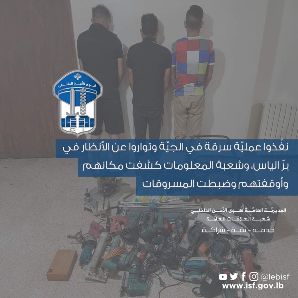 بتاريخ 6-7-2023، وبعد رصدٍ ومراقبة دقيقة، تمكّنت الشّعبة من معرفة مكان تواجدهم في داخل منزل الأوّل في بلدة بر الياس البقاعية، حيث داهمت إحدى دورياتها المنزل المذكور وأوقفتهم وضبطت المسروقات.