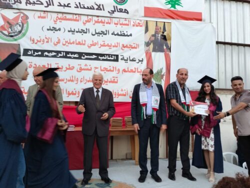 بأجواء الفرح ومشاعر الانتصار والفخر، تحول الاحتفال التكريمي للطلبة الفلسطينيين الناجحين بالشهادات الرسمية في منطقة البقاع الاوسط، الذي نظمه اتحاد الشباب الديمقراطي الفلسطيني «أشد» والتجمع الديمقراطي للعاملين بالاونروا برعاية النائب حسن مراد، الى مهرجان وعرس وطني وشعبي وطلابي فلسطيني كبير، تميز بالحضور البارز للقيادات والقوى الفلسطينية واللبنانية والحشد الكبير للفعاليات والاهالي والطلاب الذين غص بهم ملعب المركز الثقافي الفلسطيني في بلدة سعدنايل.