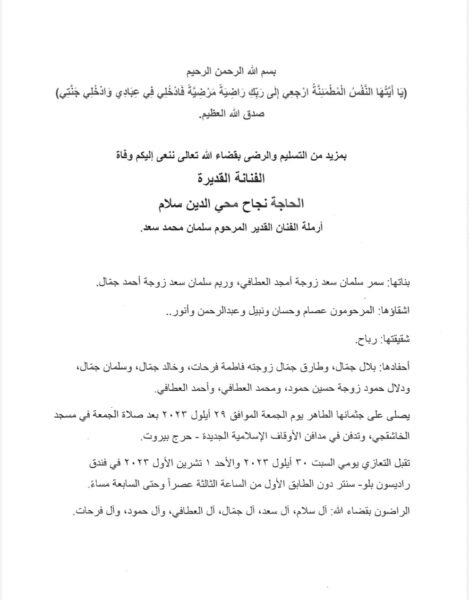 وتُقبل التعازي يوميّ السبت 30 أيلول والأحد 1 تشرين الاوّل في فندق راديسون بلو – سنتر دون الطابق الأوّل، من الساعة الثالثة عصراً، وحتّى السابعة مساءً.