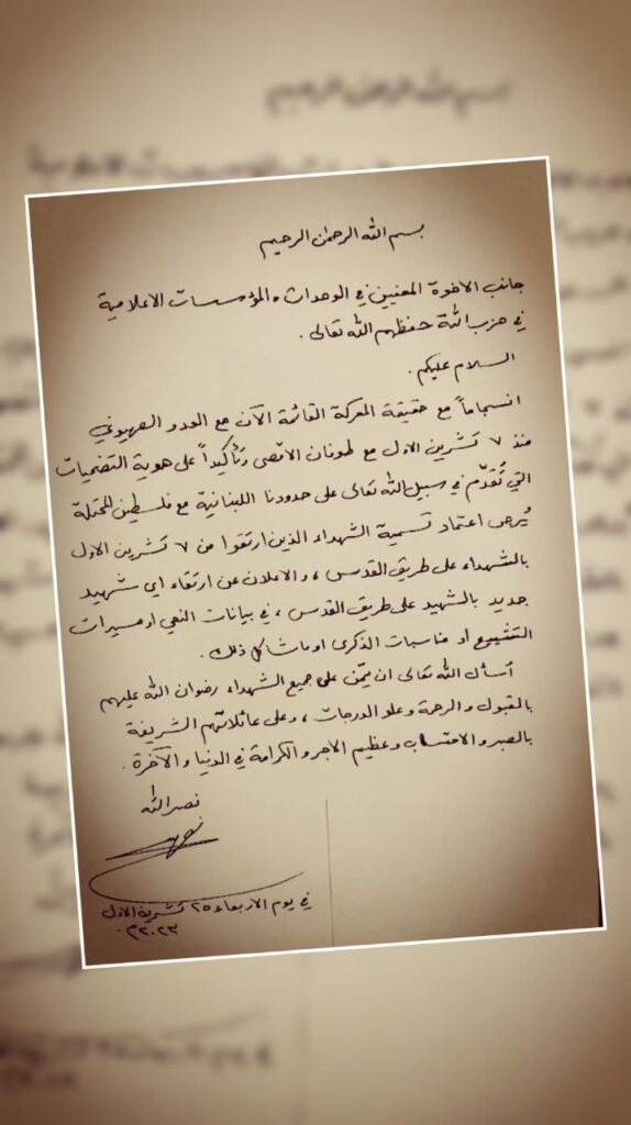 “بسم الله الرحمن الرحيم، جانب الإخوة المعنيّين في الوحدات والمؤسّسات الإعلامية في حزب الله حفظهم الله تعالى، السلام عليكم.