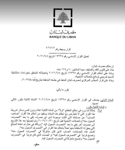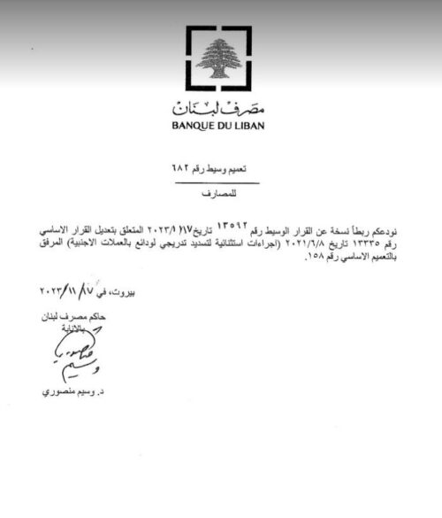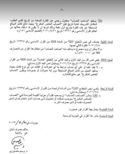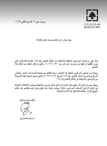 صدر عن حاكم مصرف لبنان بالانابة وسيم منصوري، بيان اليوم الجمعة، يتعلق باستفادة بعض المودعين من التعميم رقم 158 الذين اقفلت حساباتهم او تم نقلها الى مصرف آخر.
