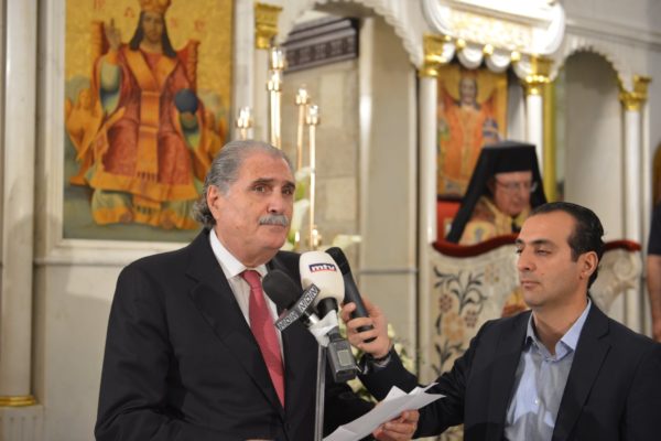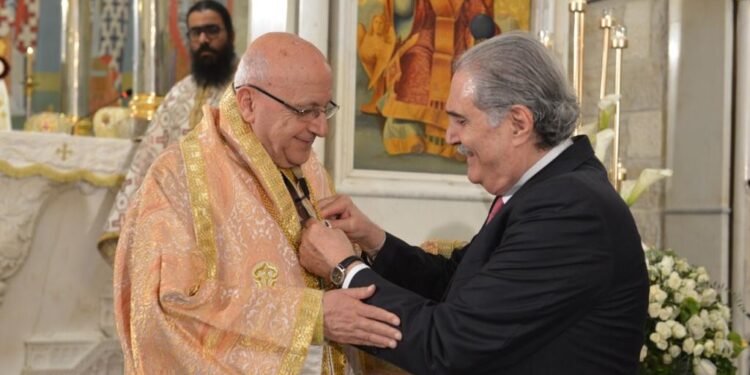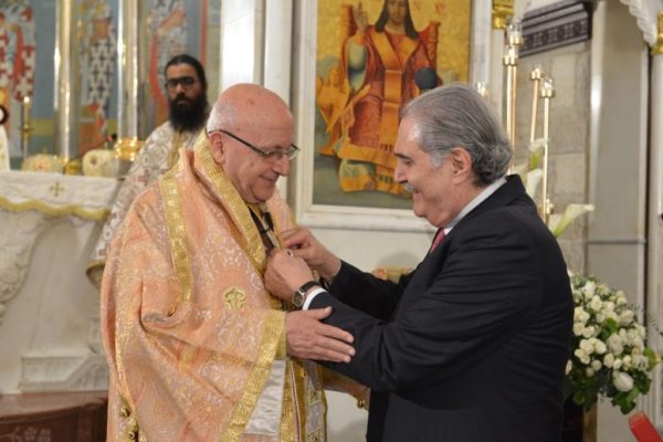 ومن ثم قلّد الوزير جريصاتي المطران درويش الوسام وسط تصفيق الحضور وترنيم الجوقة ” مستحق ” .