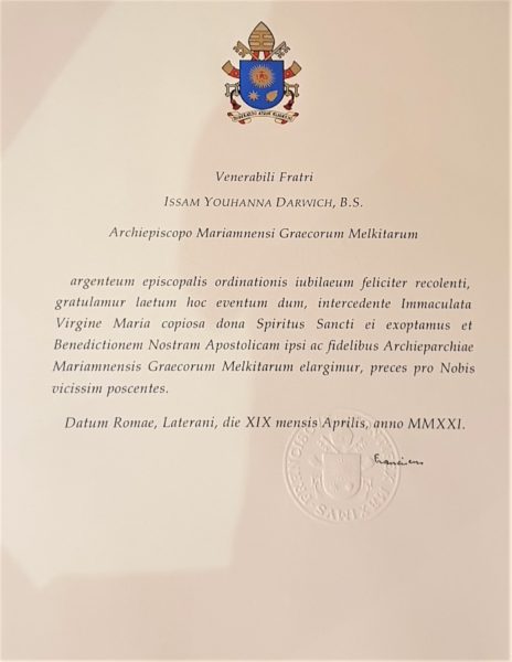 في هذا الاحتفال السعيد باليوبيل الفضي لسيامتك الأسقفية، نهنئكم بفرح بهذه المناسبة، ومن خلال شفاعة العذراء مريم الطاهرة، نتمنى لكم مواهب الروح القدس الوفيرة، ونمنحكم بركتنا الرسولية كما نمنحها لأبنائنا المؤمنين في أبرشية الفرزل وزحلة والبقاع للروم الملكيين الكاثوليك، واطلب منكم بالوقت ذاته أن تصلوا لأجلي.