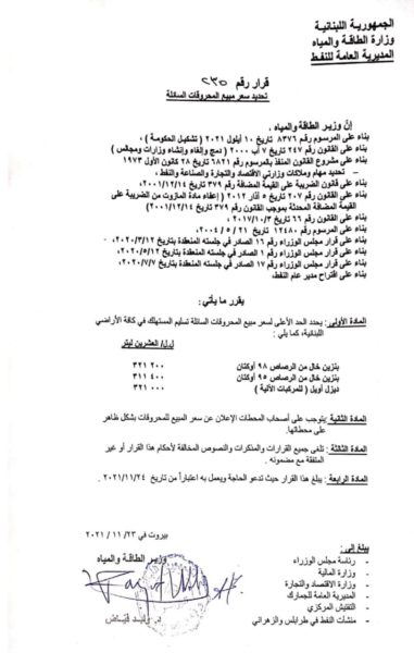 – صفيحة البنزين 98 أوكتان: 321200 ليرة لبنانية