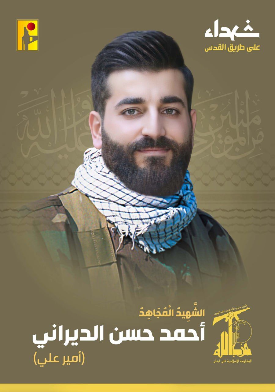 بمزيد من الفخر والإعتزاز، تزف المقاومة الإسلامية الشهيد المجاهد أحمد حسن الديراني “أمير علي” من بلدة قصرنبا في البقاع، والذي ارتقى شهيداً على طريق القدس.