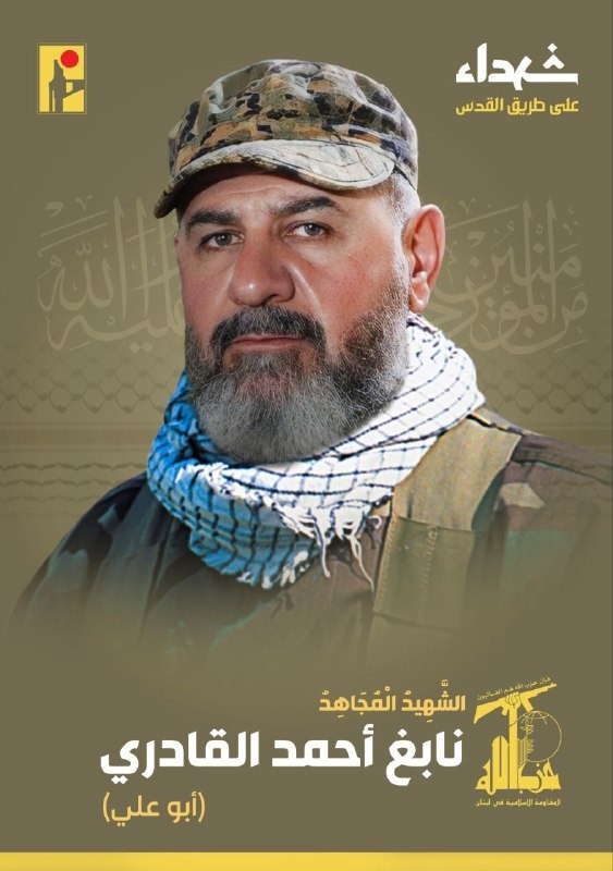 بِسْمِ اللَّـهِ الرَّحْمَـٰنِ الرَّحِيمِ {مِنَ الْمُؤْمِنِينَ رِجَالٌ صَدَقُوا مَا عَاهَدُوا اللَّهَ عَلَيْهِ فَمِنْهُمْ مَنْ قَضَى نَحْبَهُ وَمِنْهُمْ مَنْ يَنْتَظِرُ وَمَا بَدَّلُوا تَبْدِيلاً} – صَدَقَ الله العَليّ العَظِيم  بمزيد من الفخر والإعتزاز، تزف المقاومة الإسلامية الشهيد المجاهد نابغ أحمد القادري “أبو علي” من بلدة كفرشوبا في جنوب لبنان، والذي ارتقى شهيداً على طريق القدس.  #حزب_الله #الإعلام_الحربي