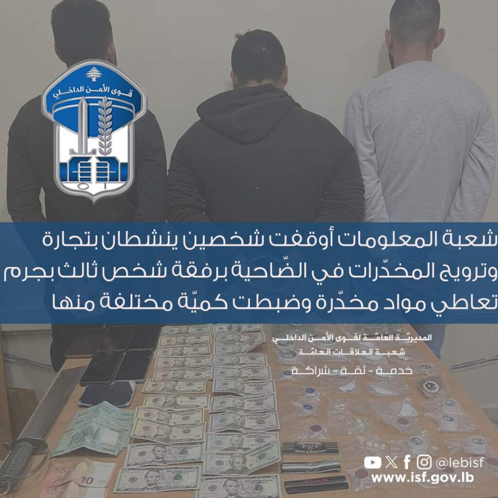 في إطار المتابعة المستمرة التي تقوم بها القطعات المختصّة في قوى الأمن الداخلي لمكافحة عمليات تجارة وترويج المخدّرات في مختلف المناطق اللبنانية، توافرت معلومات حول قيام أشخاص مجهولين بترويج المخدّرات في الضّاحية الجنوبيّة، إمّا سيراً على الأقدام، أو على متن دراجة آليّة لون أبيض.
