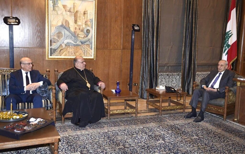 زار رئيس اساقفة الفرزل وزحلة والبقاع للروم الملكيين الكاثوليك المطران ابراهيم مخايل ابراهيم، رئيسَ مجلس النواب نبيه بري في مقر الرئاسة الثانية في عين التينة يرافقه نقيب اطباء لبنان في بيروت، نائب رئيس مستشفى تل شيحا، والمنسق البطريركي لاحتفالات كنيسة الروم الملكيين الكاثوليك بمناسبة ذكرى مرور ثلاثمئة سنة على إعادة الوحدة مع الكرسي الرسولي الروماني، البروفسور يوسف بخاش، وعرض معه الأوضاع والمستجدات على الساحة اللبنانية.