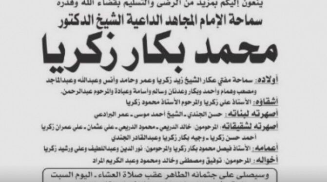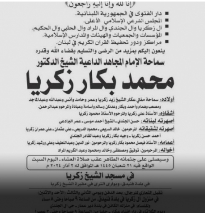 نعت دار الفتوى والمجلس الشرعي الاسلامي الأعلى وٱل زكريا وٱل الجندي وٱل المراد وٱل الحلبي وٱل الحكيم والمؤسسات والجمعيات والهيئات والمدارس الإسلامية ومراكز ودور تحفيظ القرٱن الكريم في لبنان، في بيان، “سماحة الامام المجاهد الداعية الشيخ محمد بكار زكريا”.