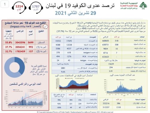 أعلنت وزارة الصحة العامّة في تقريرها اليومي حول مستجدات فيروس كورونا اليوم الإثنين, عن “تسجيل 518 إصابة جديدة بكورونا (508 محلية و10 وافدة) ليصبح العدد الإجمالي للإصابات 668605”.